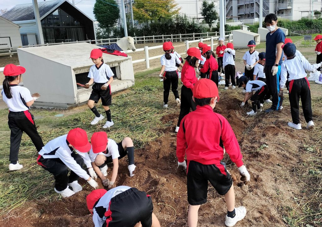1年生の生活科の授業で、屋上菜園で育てたサツマイモを採集しました。