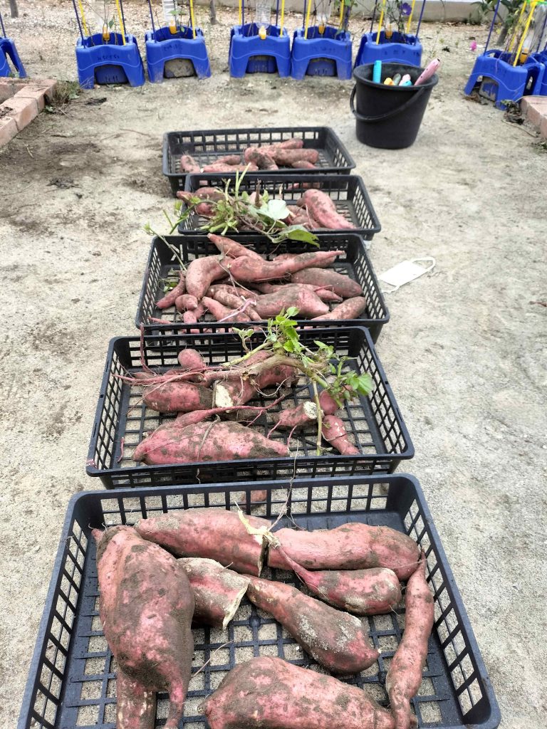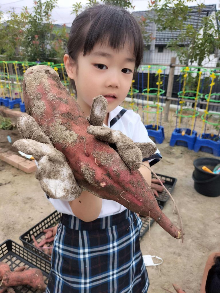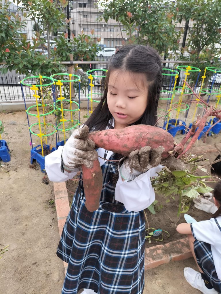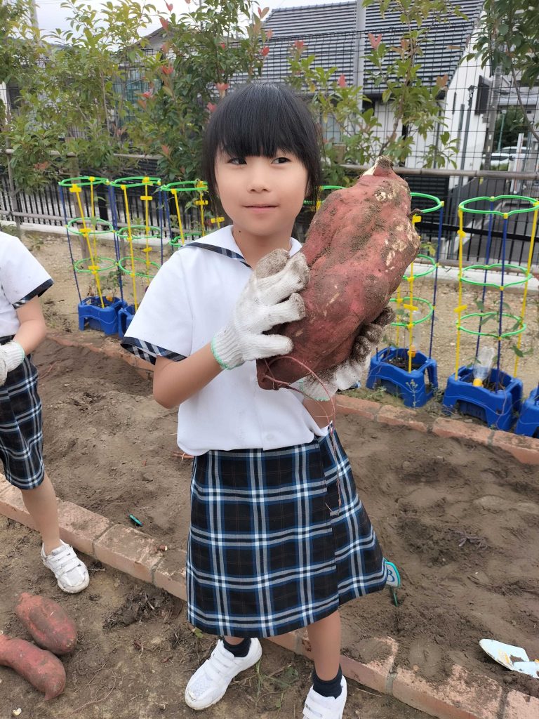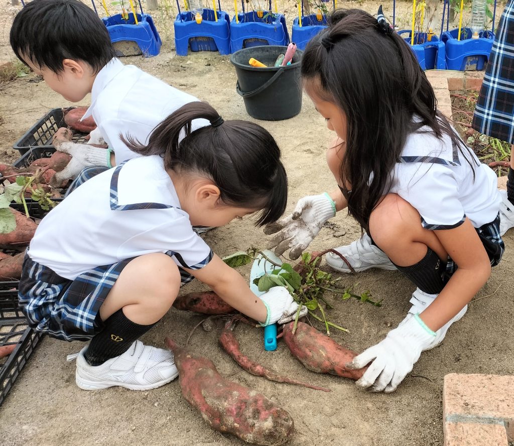 1年生の生活科の授業、学校菜園で育てたサツマイモを収穫しました。