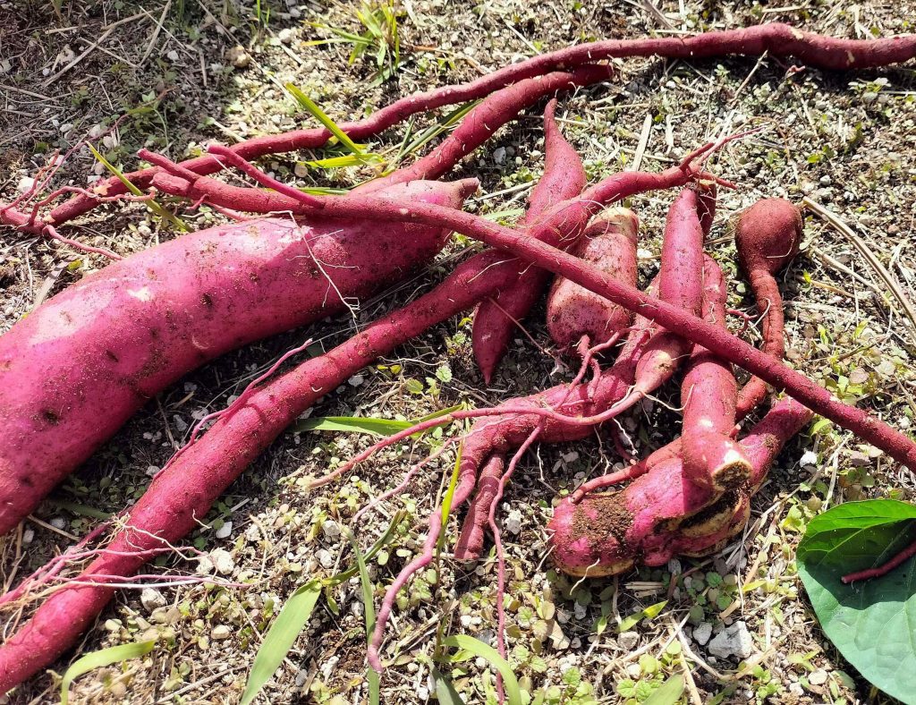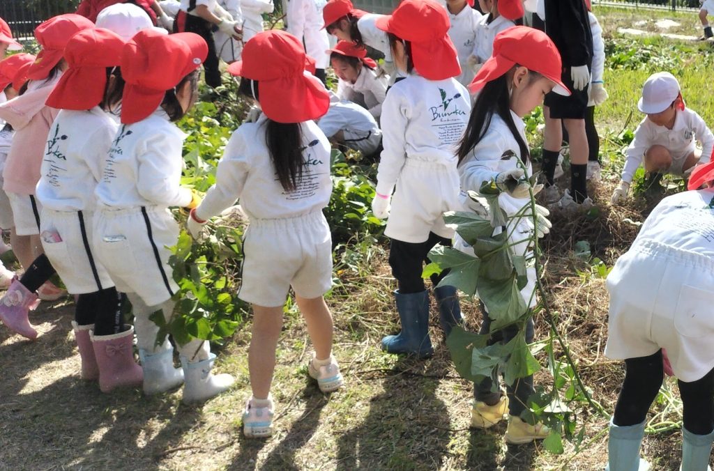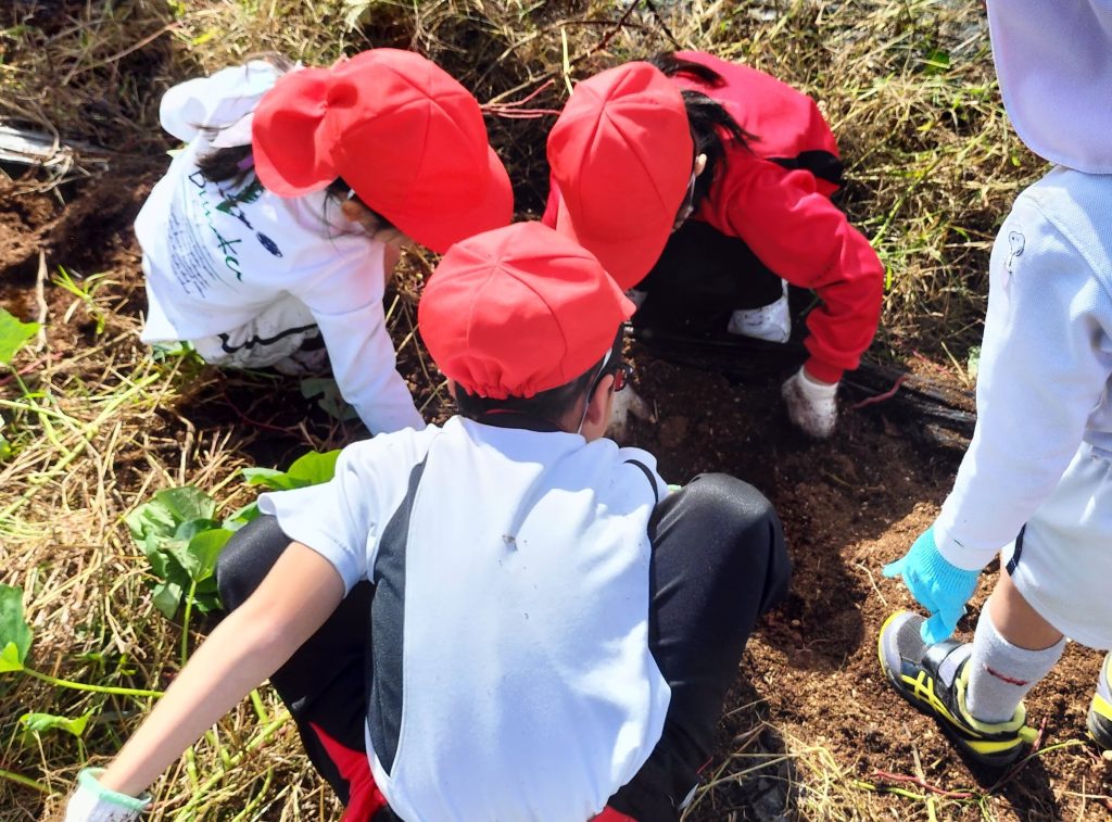 幼稚園年中組の子どもたちが来校し、2年生といっしょに屋上菜園でサツマイモを収穫しました。